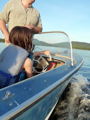 We went out to Donnell Pond in Franklin to have dinner with old friends. A sunset cruise in a classic 60s motorboat, chauffeured by our 10-year-old daughter (who drove very slowly, with an occasional burst of speed that toppled us sideways) followed by food, wine, and conversation...life is good.