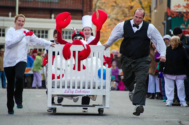 What happens in a tourist town when tourist season is over? In Bar Harbor, we have a Pajama Sale to celebrate. Stores open at 6am, with coffee, doughnuts, and discounts for anyone who comes in their pajamas. This year was the 19th annual Pajama Sale, and it has become enough of an institution that lots of us have bought special pjs just to wear for the sale. Some people go all out with curlers in their hair, sleep masks, and green face goop. At 10am, when I am usually shopped-out and starting to feel a little silly wearing my robe and slippers in broad daylight, there are Bed Races. A short segment of Cottage Street is barricaded off for the racecourse: